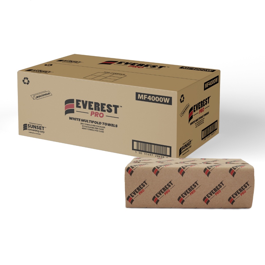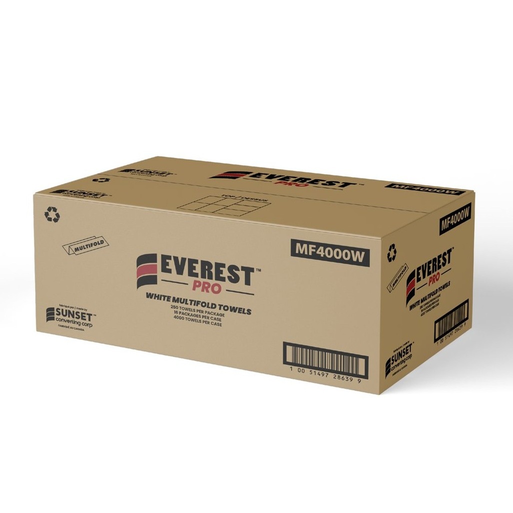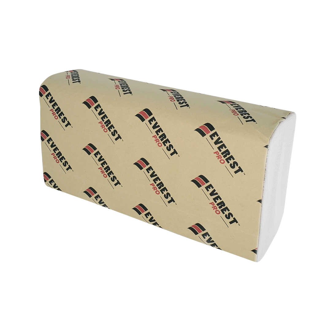 Everest Pro's quality white multifold towels provide superior quality 1-ply performance. With 250 sheets per pack and 16 packs per case made from recycled paper, this product is ideal for use across all markets, including homes, restaurants, retailers, office buildings, and hotels. Made in Canada.