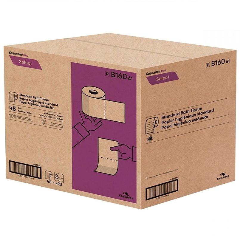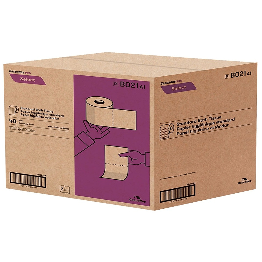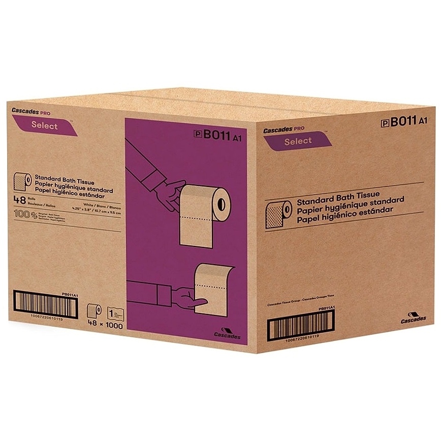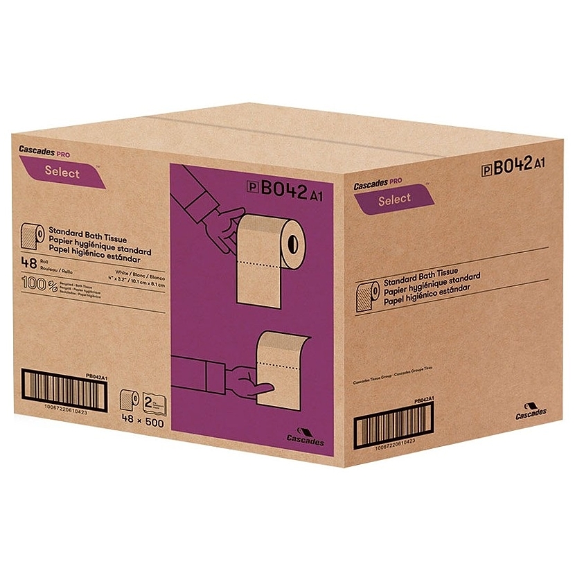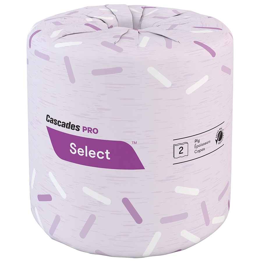 The economical choice, Cascades PRO Select® standard toilet paper provides reliable performance at a low cost. Soft and gentle on skin, this eco-friendly product is made from 100% recycled fiber and offers the ideal choice for those needing a strong and absorbent bathroom tissue. This product is biodegradable and safe for plumbing and septic systems.