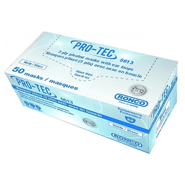 Ronco Mask Pleated 3-Pleated Made from non-woven polypropylene. A barrier against fine dust and dry particles. Ideal for non-sterile medical and dental procedures. Their soft pleated material is fluid-resistant and offers "cool breathing" comfort at 99% Bacterial Filtration Efficiency (BFE). Latex free.